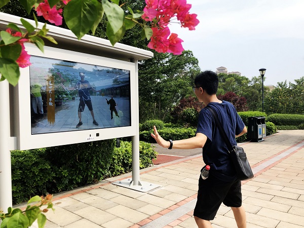 了解了南翠屏公園的整體規(guī)劃和布局,接下來進入我們今天的主題,南翠屏公園的AR太極。AR太極設(shè)備把太極拳和AR技術(shù)相結(jié)合,實現(xiàn)面對面教學。市民、游客可跟隨畫面指引體驗太極招式。AR會自動識別市民、游客動作,并打出分數(shù),讓大家聯(lián)系太極拳的動作規(guī)范,進而實現(xiàn)強身健體的目的。做得好的體驗者還可觸發(fā)系統(tǒng)自行拍照并生成二維碼,留存和分享自己的照片。AR太極設(shè)備讓每一位來這里游玩的公眾都忍不住來體驗一把這個“新奇的大家伙”。