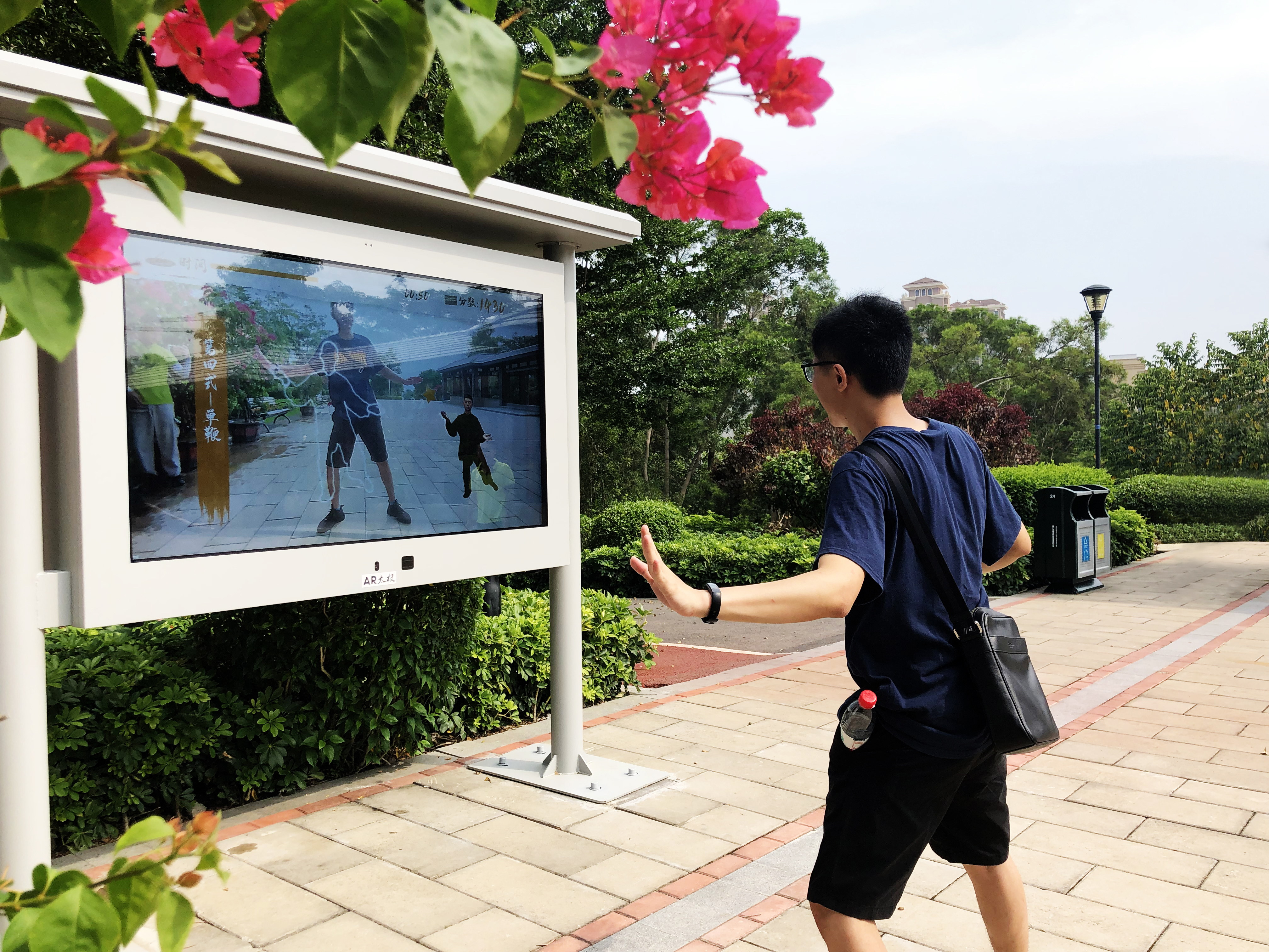 通過把太極拳/或廣場舞和AR技術(shù)、AI技術(shù)相結(jié)合,在公園設(shè)置一塊人工智能AI大屏,屏幕中會有太極大師教鍛煉者打太極,同時屏幕還會“檢驗”鍛煉者的學(xué)習(xí)情況:實時捕捉鍛煉者全身的關(guān)節(jié)點,將鍛煉者的動作與太極大師的動作比較并給出評判。