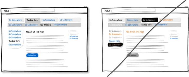 應(yīng)用視覺元素之手法可以幫助使用者了解頁面上的功能與結(jié)構(gòu),例如顏色、深度與對(duì)比度等。同時(shí)為了與你的使用者精準(zhǔn)的溝通,需點(diǎn)擊的行為(如連結(jié)或按鈕)與需選擇的元件(如選單)設(shè)計(jì)上要有所區(qū)別,同時(shí)上方的文字必須描述清楚,才有利使用者辨別。在底下的例子中,作者選擇了藍(lán)色做為網(wǎng)站上使用者可點(diǎn)擊元件的主色,而黑色為標(biāo)示已選擇的項(xiàng)目或是現(xiàn)在頁面的名稱,簡單明顯的顏色應(yīng)用,讓使用者藉由顏色的線索更輕易的學(xué)習(xí)和使用網(wǎng)站功能。最后請(qǐng)記得,千萬別使用難以辨識(shí)或過多的顏色混淆使用者。