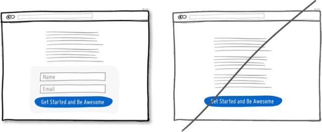 當(dāng)頁面上有一些我們期望使用者做,并會(huì)帶來價(jià)值的功能時(shí)(例如留下聯(lián)絡(luò)方式),最好可將實(shí)際的表單或欄位放置于本頁上。如下圖,欄位若能與頁面整合在同一層,其帶來的好處大于還要連結(jié)至別頁輸入的方式。